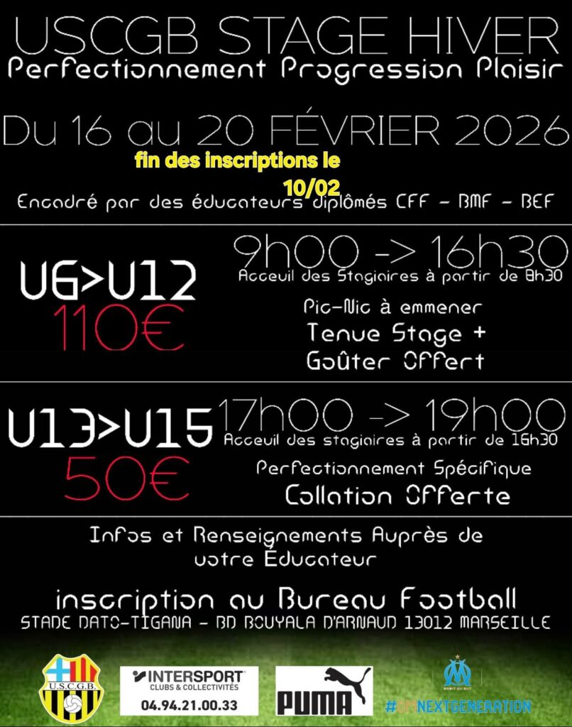 L’USCGB vous propose ses stages de perfectionnement pour la deuxième partie de la saison. Nous vous proposons d’accueillir, pendant les vacances scolaires, vos enfants afin qu’ils vivent toujours et encore leur passion du ballon rond.